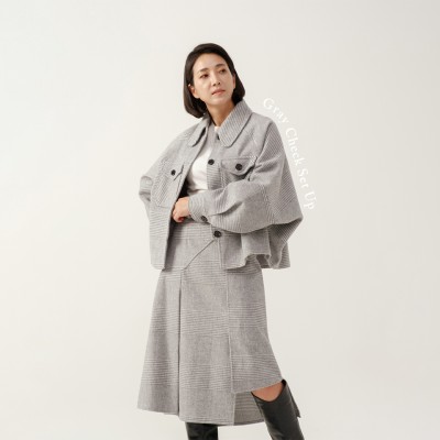 - 미즈스토리 MIZ S2021_01_체크 그레이 버튼 숏 코트 벨트 미디 스커트 셋업
