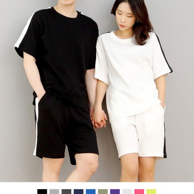 남녀공용 배색라인 무지 반팔 상하의 세트